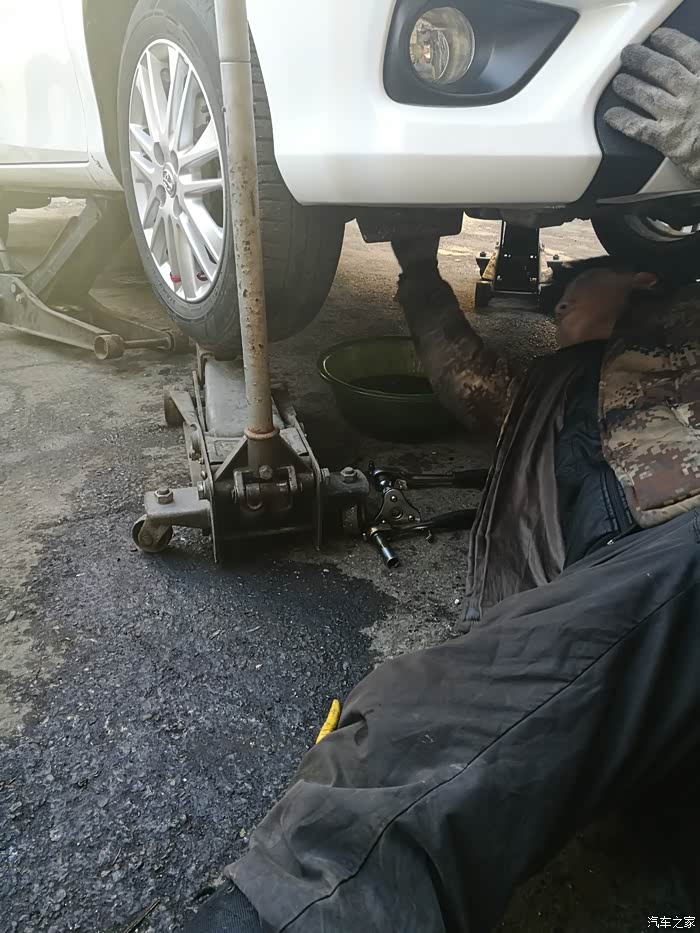将小威架起一定高度后维修师傅就可以到车底将原来的废机油轻松排出,有好多地方现在有一种说法是可以机器排油,说是可以更彻底的将原来的机油排出,其实本人觉得都是一种噱头,人工排油也是相当不错的。