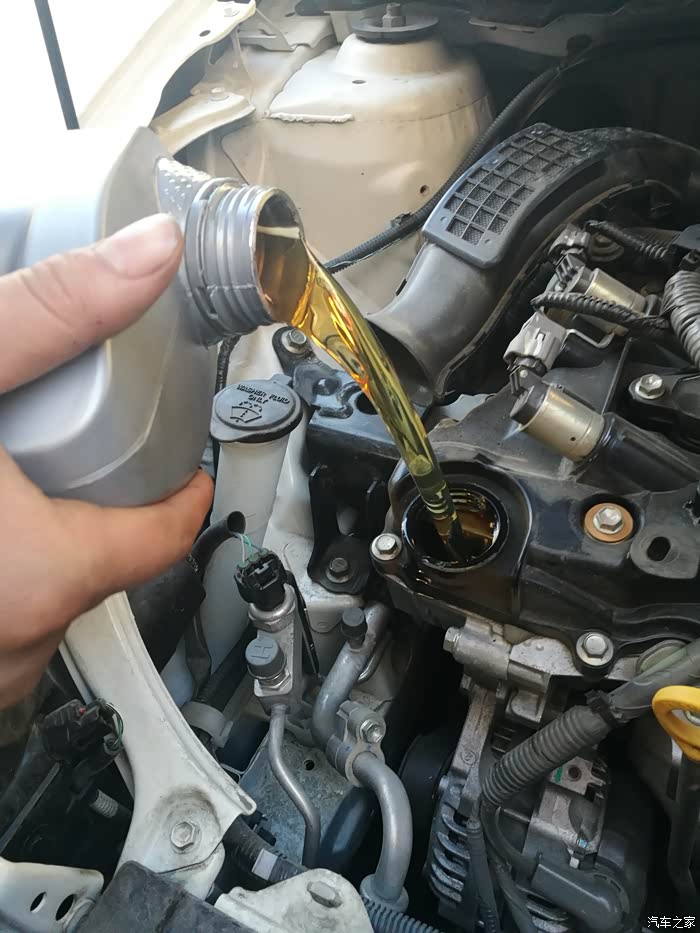 这一步其实并不复杂,只要简单把新的机油倒进机油箱内就可以了。