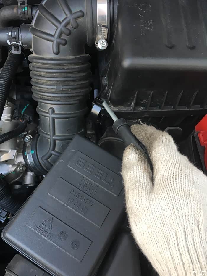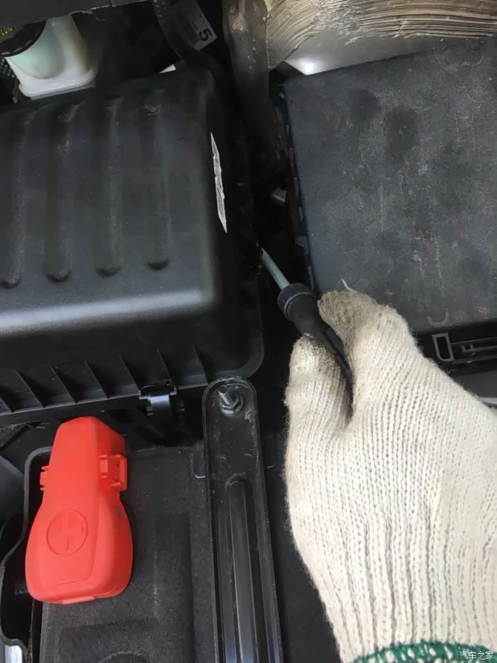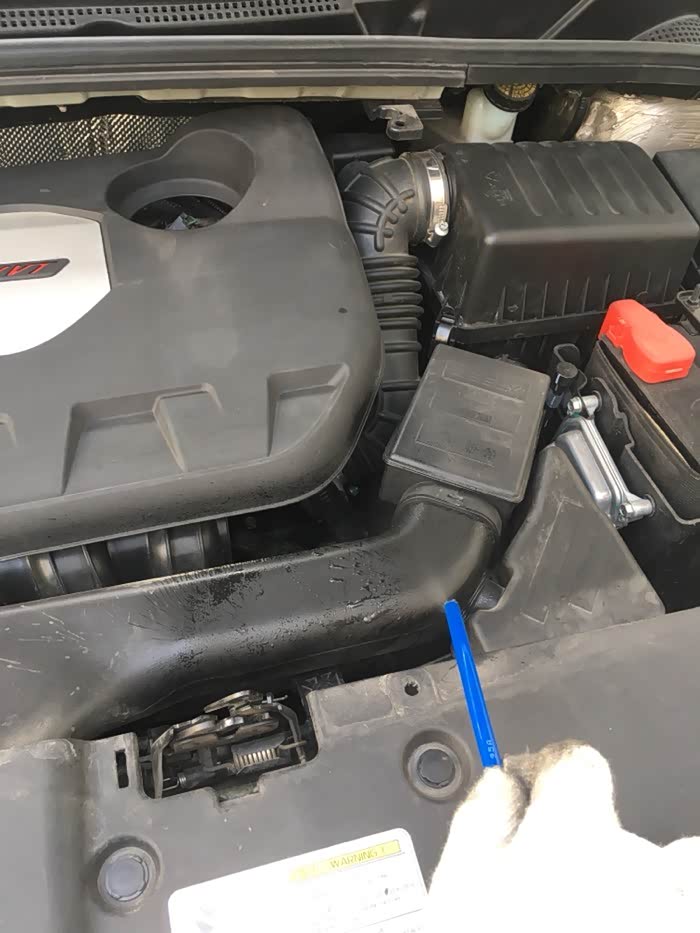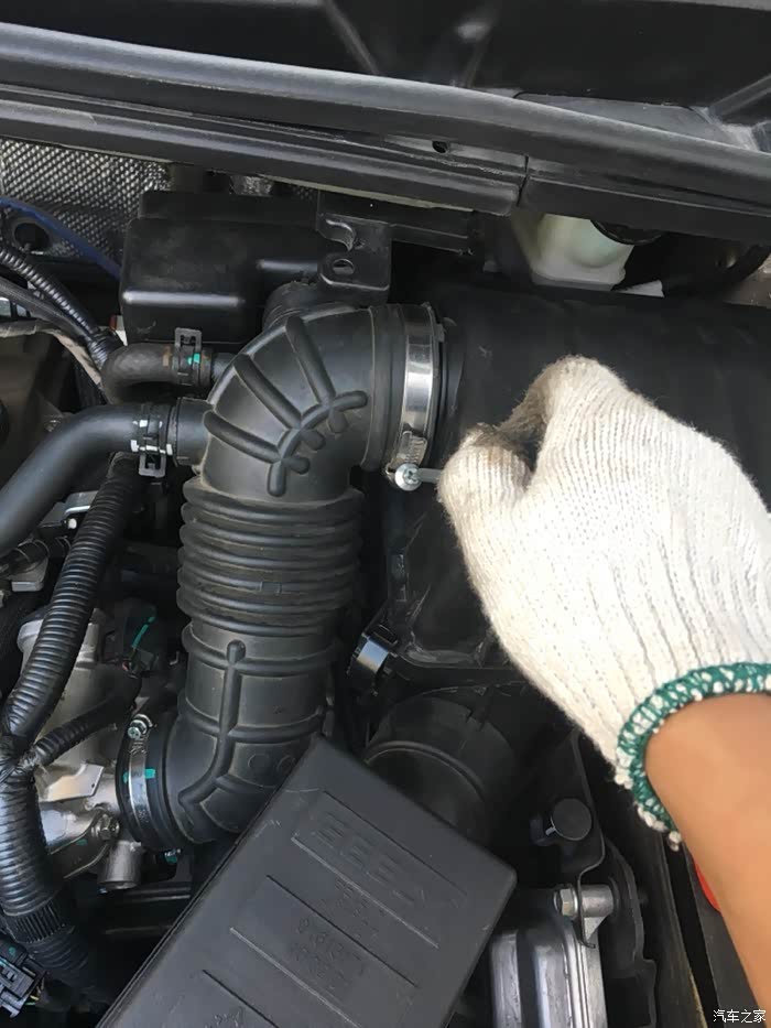 下面检查空气滤芯。有一颗螺丝连接进气歧管。拆掉螺丝,拔出气管