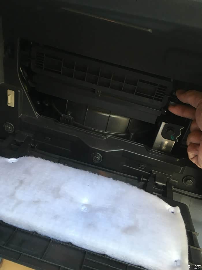 拆了手套箱就可以见到这块板子,两边卡扣。用手捏住就拿出来了