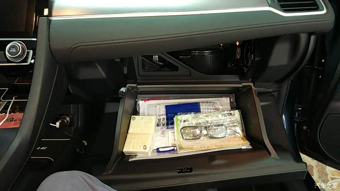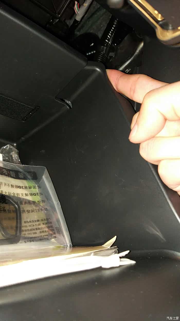 首先打开手套箱,从手指指的地方,两边同时往内测用力一压,手套箱就会落下。