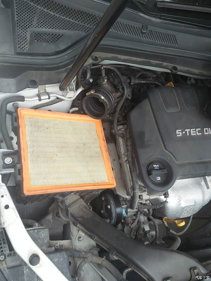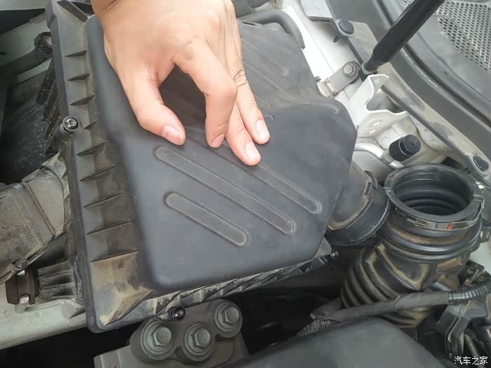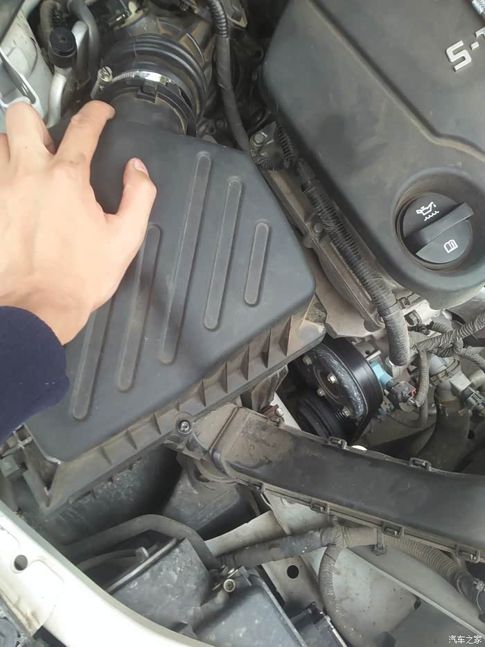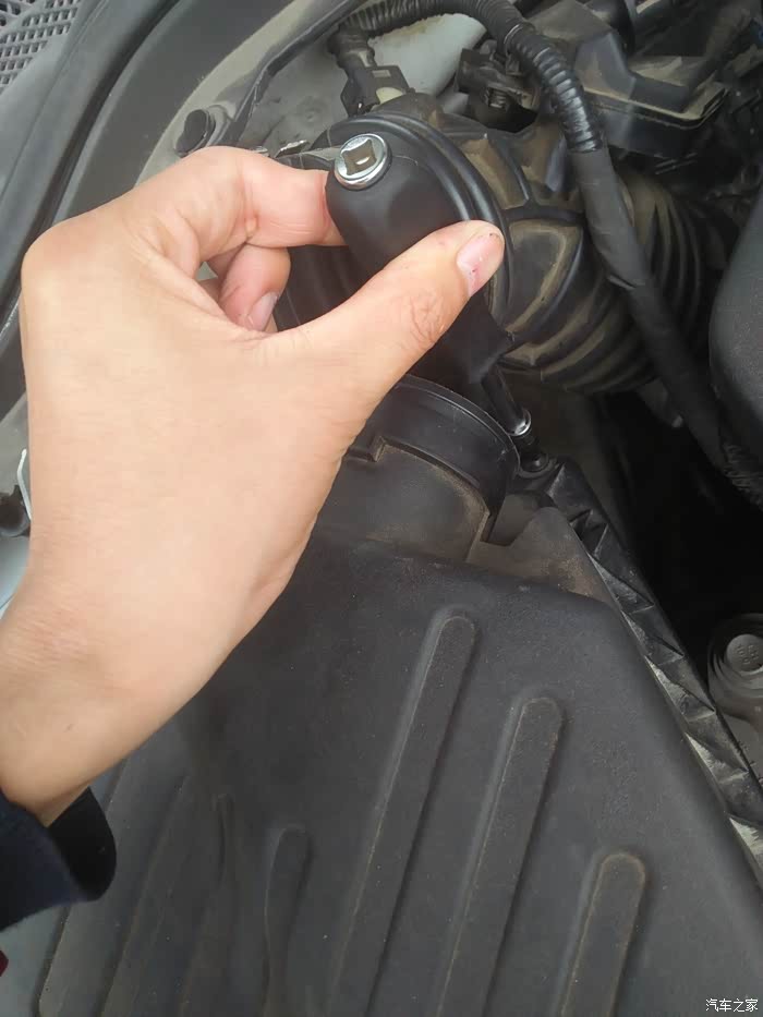 第四步如图用上面的工具.把进气管道往旁边掰掰.【为了顺手一点】,用工具扭开盒子上面的螺丝。按照对角的顺序依次拆下盒子上面的四颗螺丝,扭松方向为逆时针方向【几乎所有常见的螺丝都为顺紧逆松】。注意螺丝要拿下来的时候小心别掉发动机舱里了,螺丝很小掉进去了很麻烦!