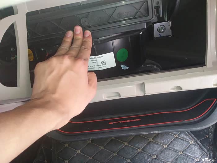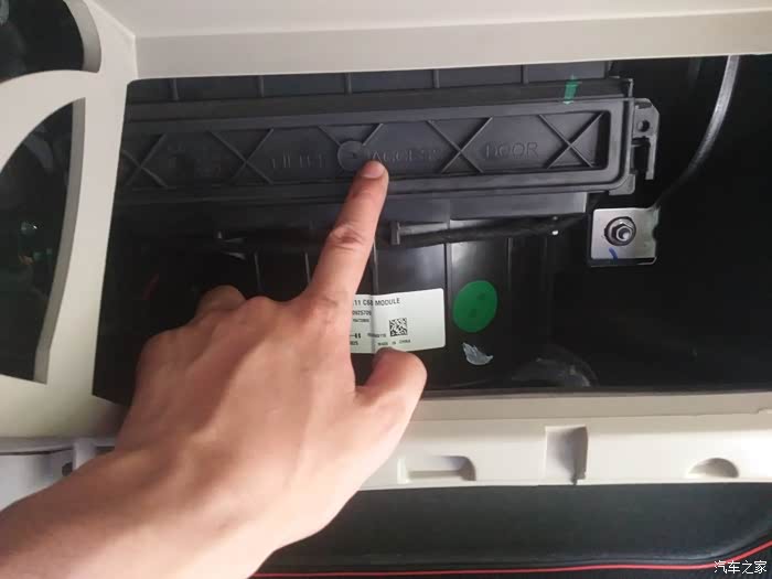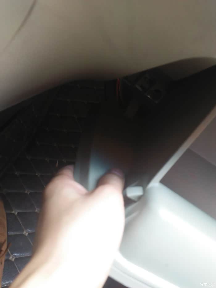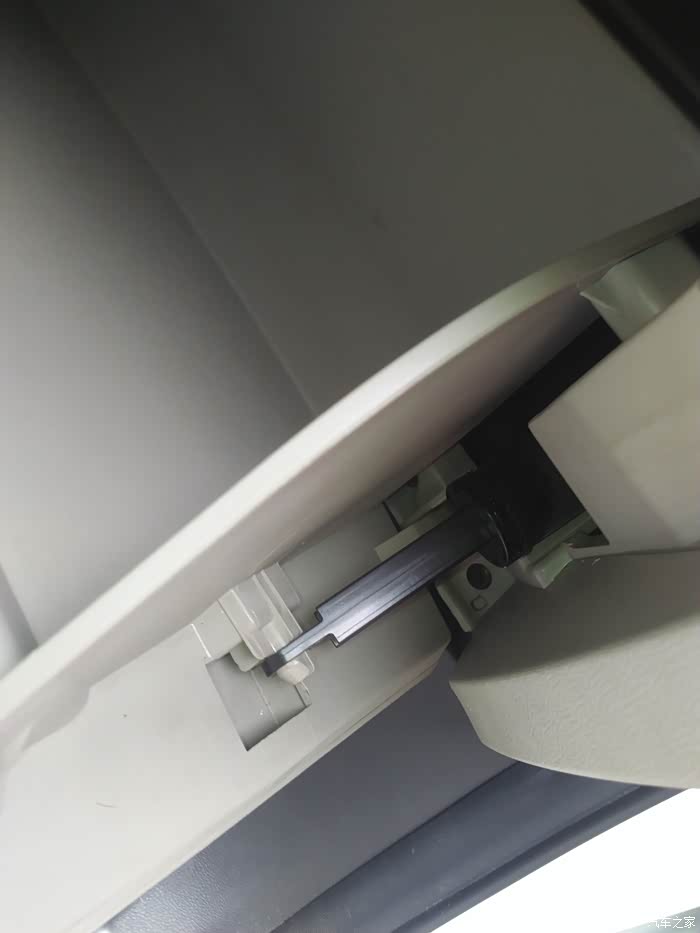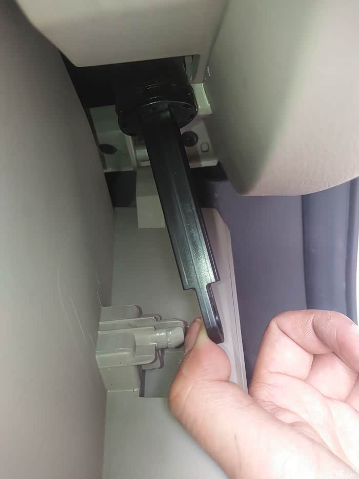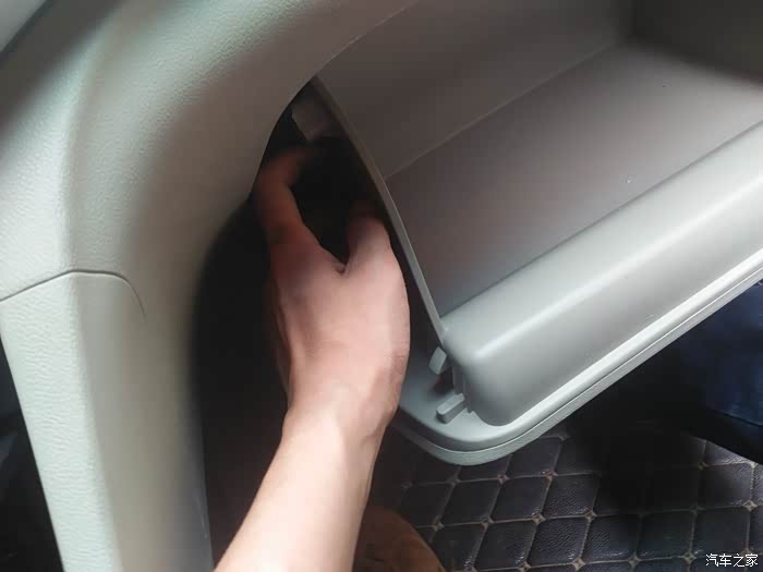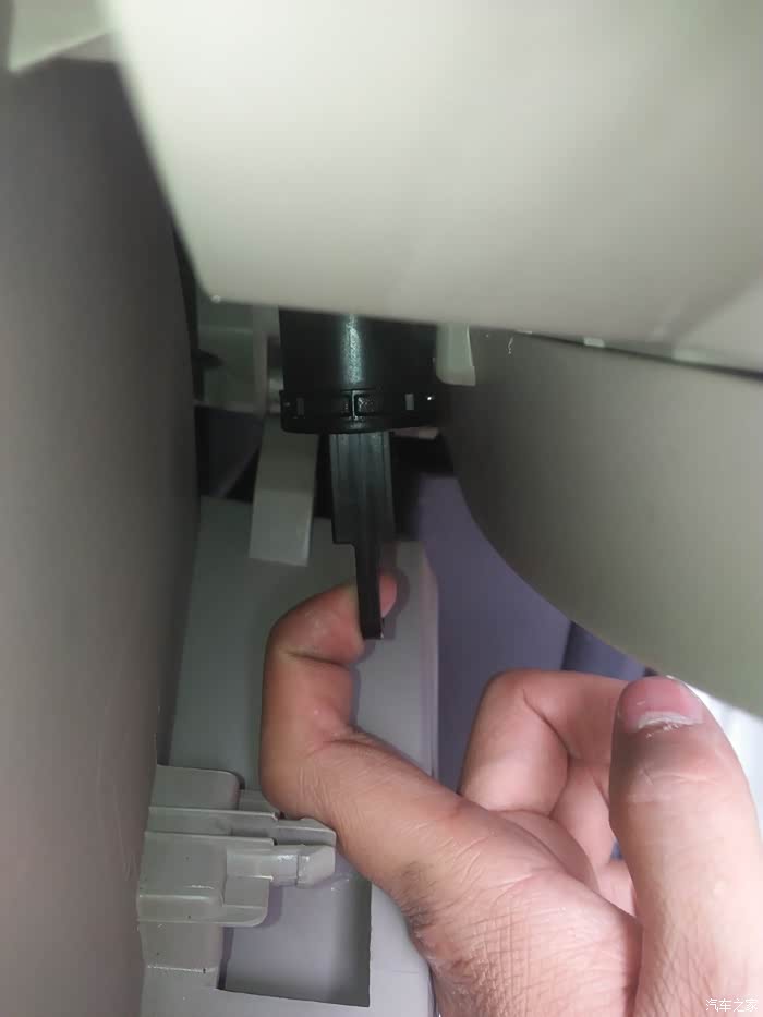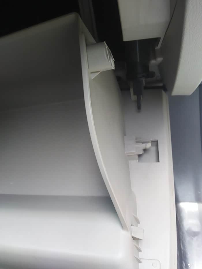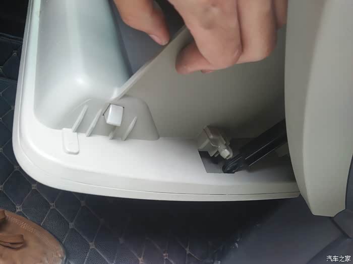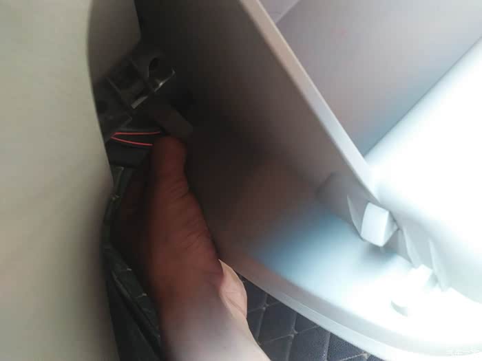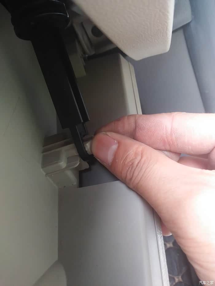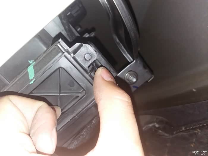 6 然后双手抓住如图大拇指按压的这个位置用力往中间挤就把抽屉的上方的两个‘头’【食指位置的为头,左右各一个,挂在车里面两边的凹槽里用来活动的】。 用力往中间挤压然后取出来。 此时只有抽屉的右下角还连着车体。