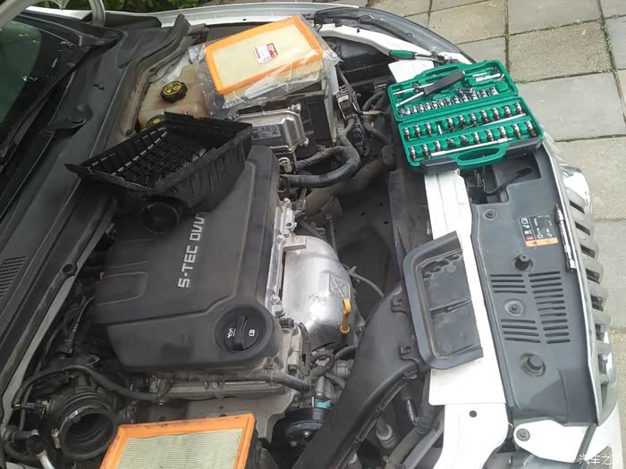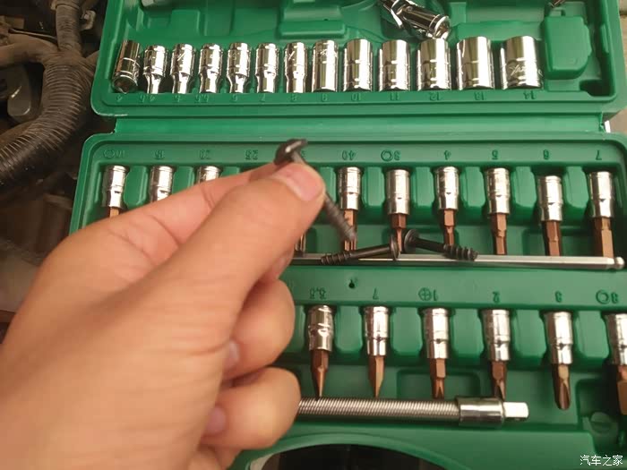 拆下滤清盒子的四个螺丝,我暂时把他保管在这。【画面上这绿色工具就是我先介绍到的那套】螺丝暂时放里面好找点.