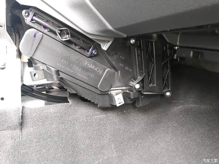 第七步:取下副驾驶脚下空调出风导管。就是这个,是卡上的,摇一摇就可以拔下来。