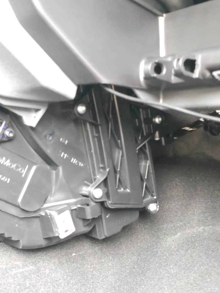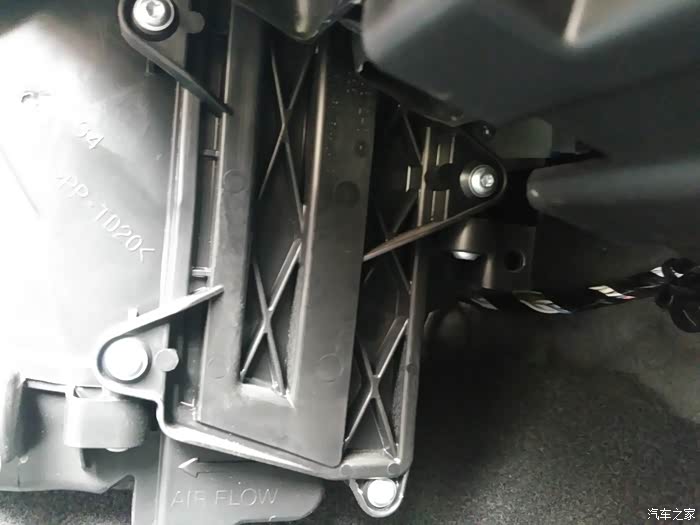 这里要解释一下,为什么要取掉手套箱和副驾驶脚下空调出风导管?原因有二:一是空调滤芯盖板的第五个螺丝在里边,看不到,而且空间小,梅花扳手无法操作;二是后边取出旧滤芯、安装新滤芯没有足够空间操作。这两个部件取下后便于眼睛观察,空间更大了,后面安装螺丝、滤芯更方便。