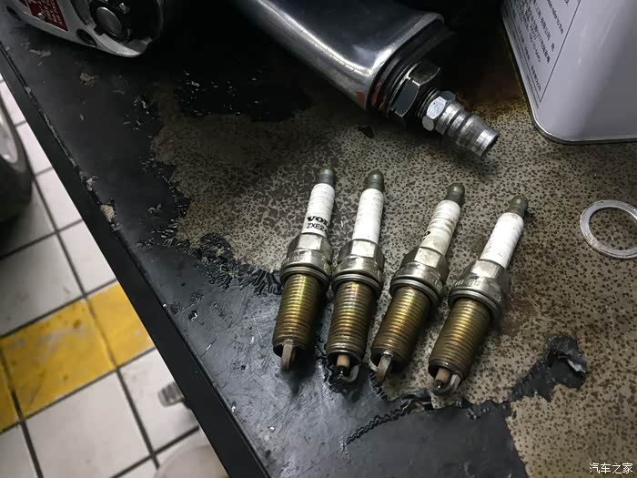 已经在装第三个了。和维修小哥聊了一下,火花塞这东西很好理解。就是抽烟用的打火机,火花一冒点燃汽缸内汽油,车子才能正常运转。打火机用久了会失灵,火花塞也一样,一般四五万公里左右就得更换了。我T5是4缸发动机,所以有四个火花塞更换。