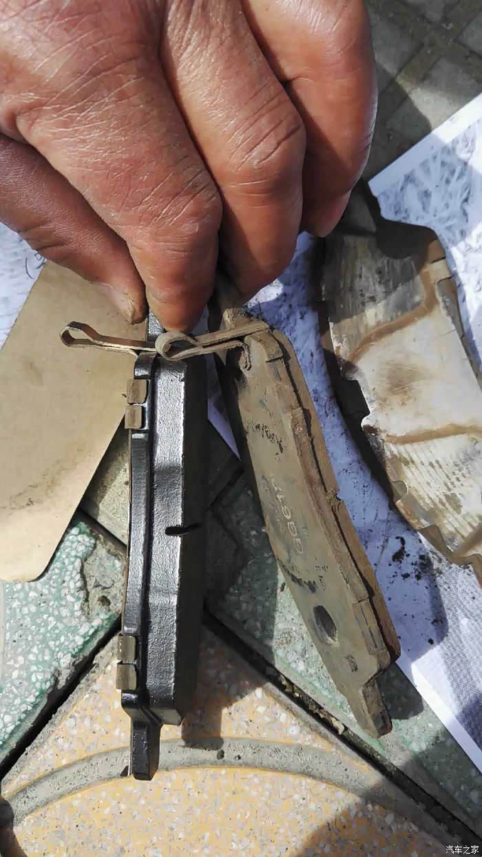 旧刹车片,拆卸比较简单,但是安装过程还是比较费时间的,都是细致活啊,由于都是一个人操作的,拆卸、安装过程就没有拍照了,好在论坛上车友操作过程图片都有~~~