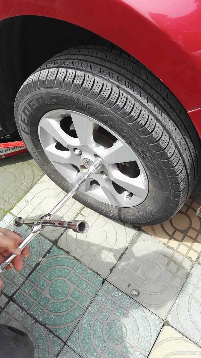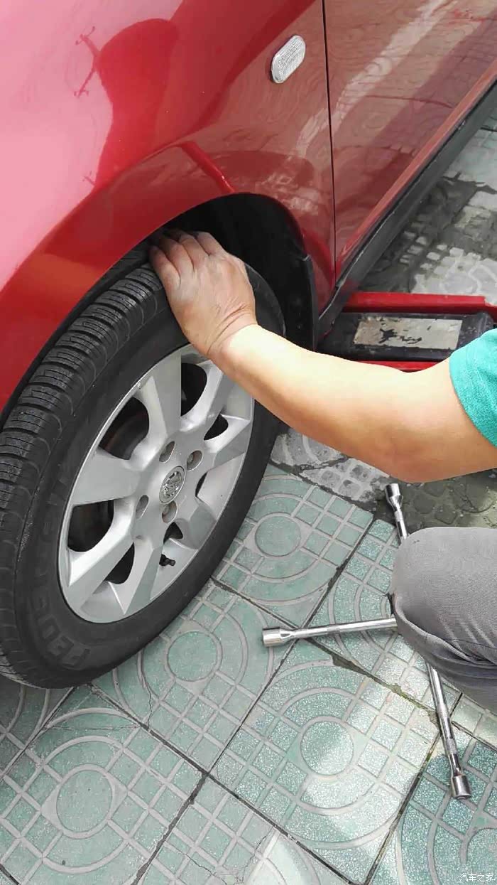 1、千斤顶支起~~~准备拆卸轮胎~~~