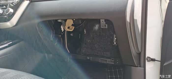 打开手套箱,上面有三颗螺丝,十字的,一般家里都有的简易工具,同样的,在手套箱下方也有三颗螺丝,总共六颗螺丝,松掉就可以把手套箱拿出来了