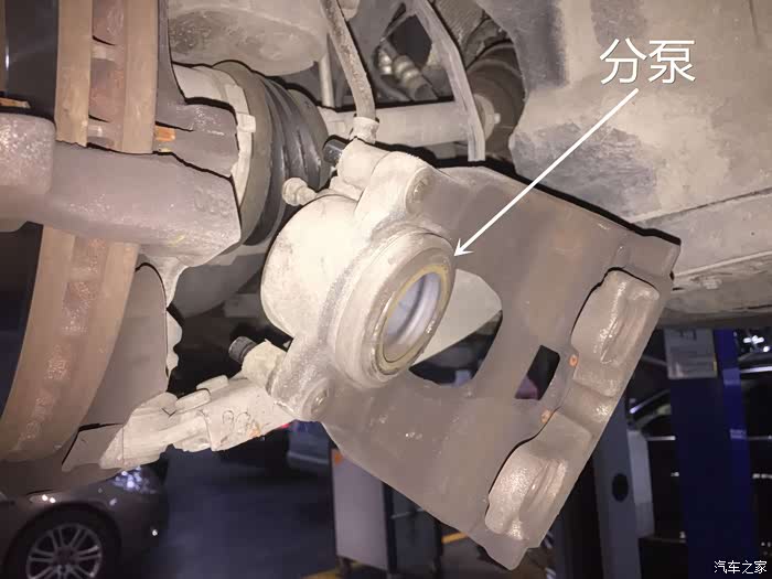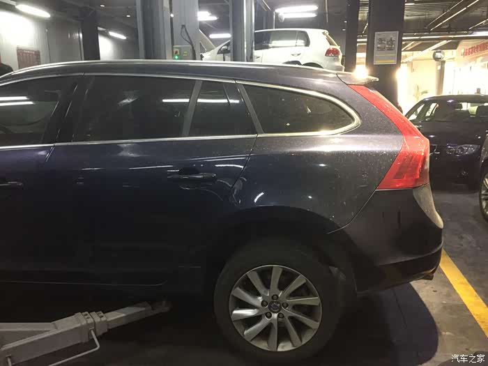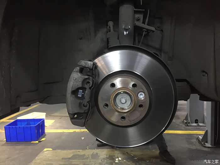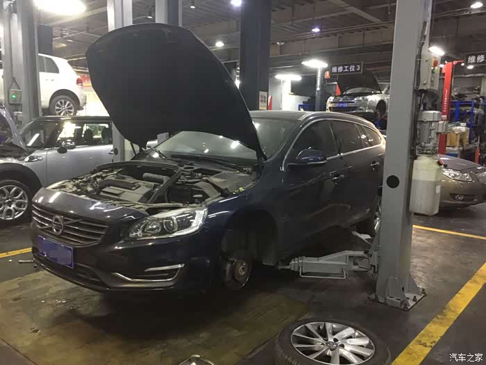 差点忘记了主题,这台V60前部的刹车片已经不剩多少了,需要对其进行更换。V60的前部刹车片采用的是单活塞的浮动式卡钳,比较常见。