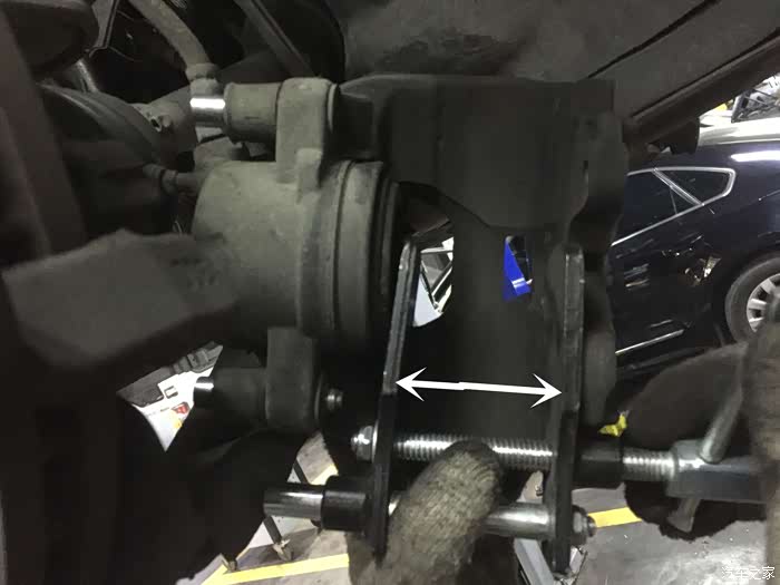 由于新旧刹车片的厚度不一样,所以分泵活塞的向前顶出的长度也不一样。为了能够将新的刹车片安放进去,必须分泵活塞复位到起始位置。这个过程有点吃力,专用工具的效果会比较好,利用螺栓在螺纹转动的力量就可以轻松的做到了。切记复位过程不要太快,要不然会很有可能导致分泵漏油的。
