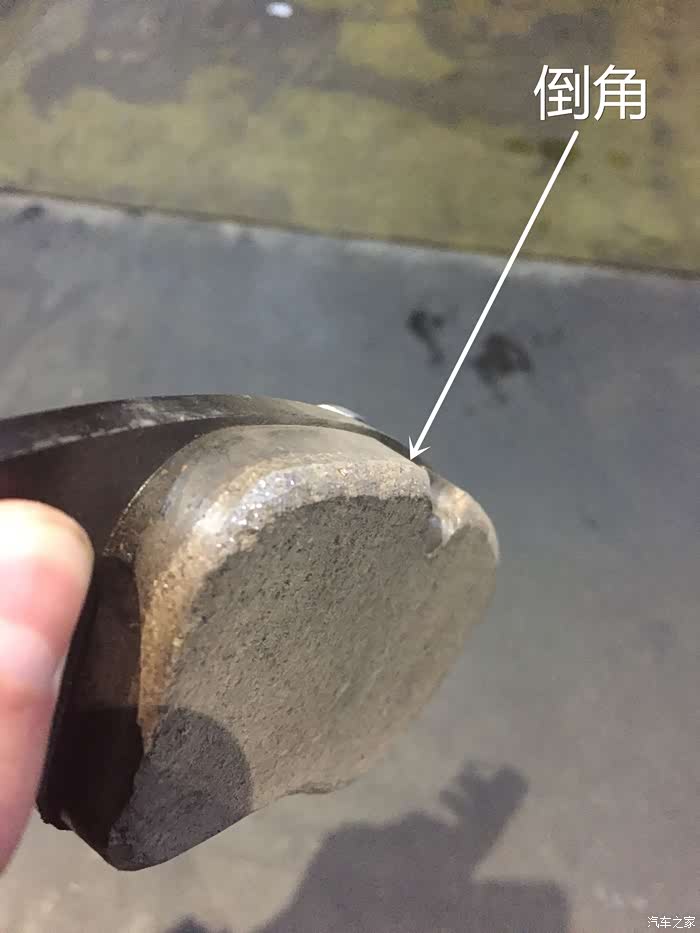 在更换新的刹车片的时候,最主要的任务就是要将刹车片进行倒角。也就是将刹车片的边缘进行打磨,目的只有一个就是防止刹车片跟旧的刹车盘摩擦产生异响。因为旧的刹车盘在长时间的使用中已经在刹车盘的内外边缘产生了深深的凸痕,这个凸痕会跟新的刹车片摩擦产生异响。哪怕是不踩刹车的情况下,踩刹车就不用说了一定会响,这也是为什么很多刚刚新换的刹车片会存在异响的缘故。