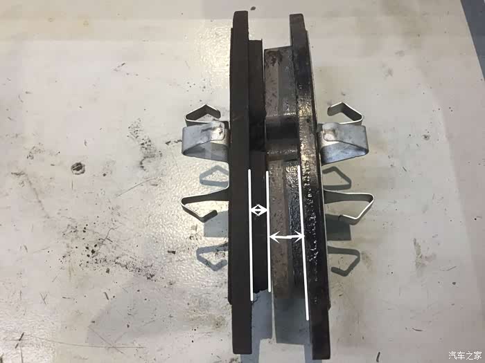 前部内侧的刹车片已经不剩多少了,通过新旧对比可以发现也只是剩下不到一半左右的厚度。