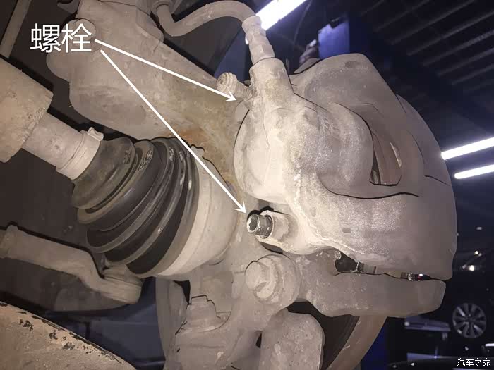 刹车卡钳通过两颗螺栓进行固定,安装的时候要用扭矩扳手上紧,过扭会导致这个螺栓直接断掉的。所以设想一下,开始的时候突然间失去刹车是有多么的恐怖。