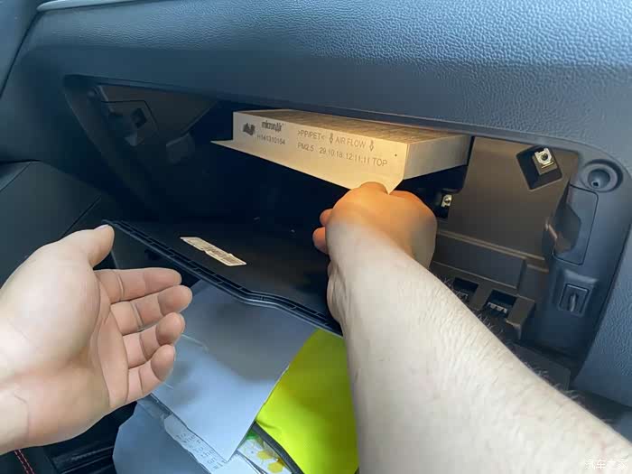 拆下手套箱以后就可以拿出滤网了,非常的简单,学会了以后自己就可以更换了。