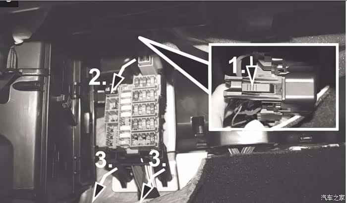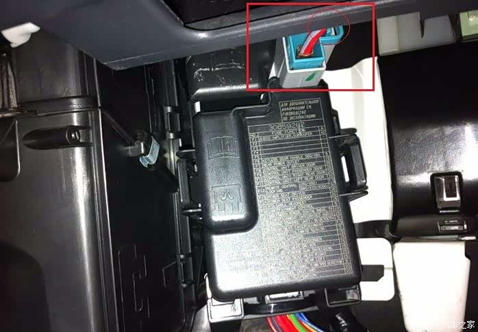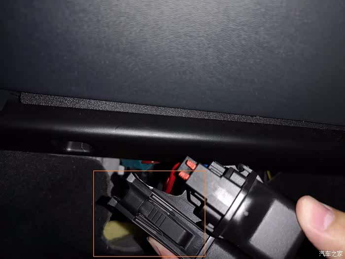 此处为难点,左手伸进去,在蓝色插头上部,整个保险丝盒上部分,左边低右边高,左边低的部分有一个卡扣,左手中指按住,往外拉,使点劲,掌握了技巧很容易。拉下来就可以把保险丝盒平躺着拿出来。
