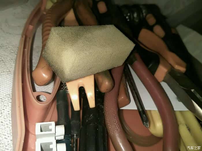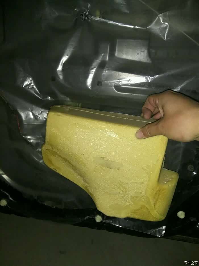 遗落在车夹层中的海绵块,方方正正的,后来发现在车门上有一个胶粘的痕迹,大小与它正合适,想必是用于减震的,但是装车没多长时间,它就因为没粘牢,掉了,不然海绵块上也不会一点压痕也没有。