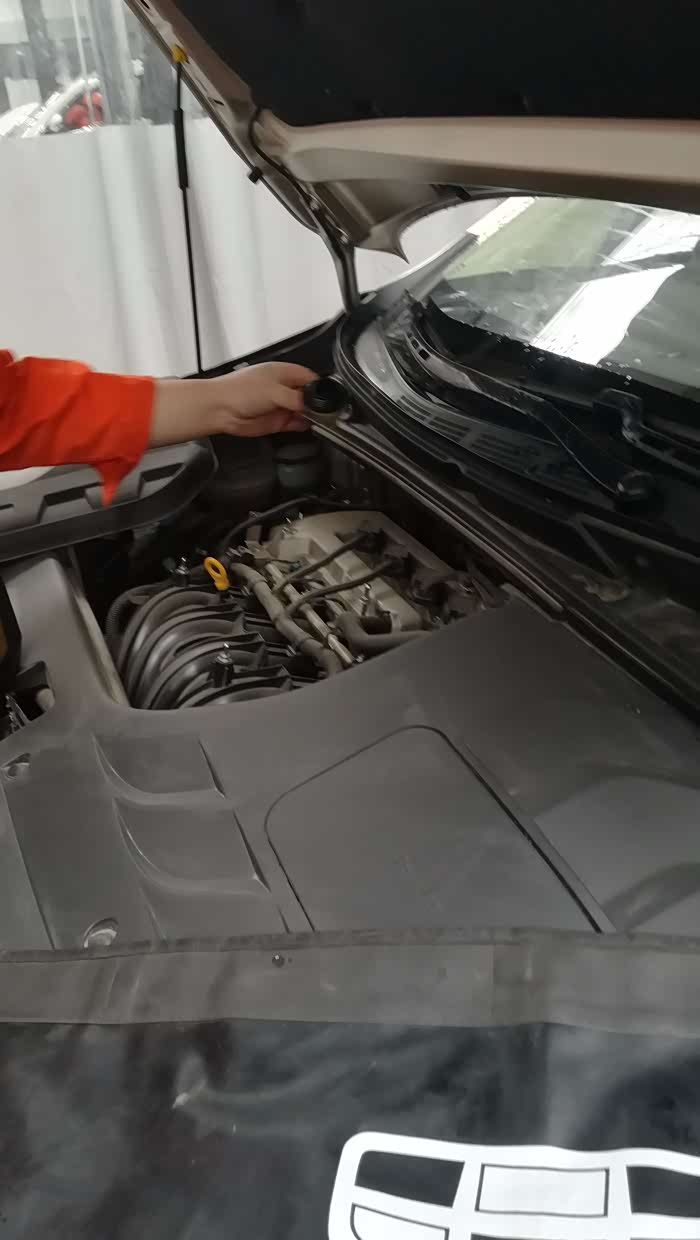 前面开始加机油了,细心的给两侧铺上防尘罩,真细心