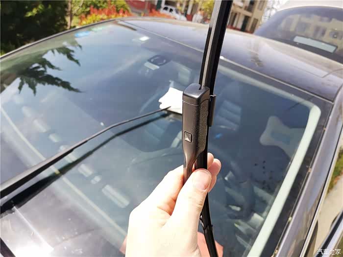 把雨刷往外的方向搬起来,方便操作,然后用手指按下这个小四方块,用力往上抽雨刷,就可以轻松地把雨刷取下来了。