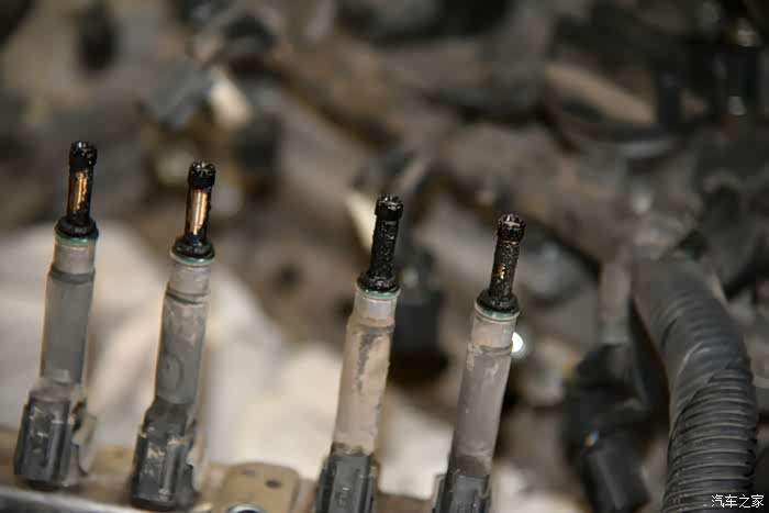 一共八个喷油嘴,全部都有积碳,看起来黑乎乎的