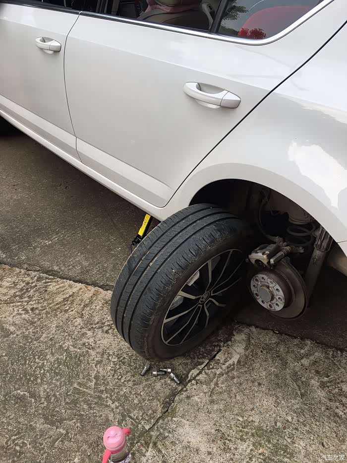 要先把轮胎螺丝拧松在用千斤顶顶起来。不然先顶起来的话,再拧螺丝就轮胎空转使不上劲。一般来说轮胎螺丝非常紧,扳手套好螺丝之后用脚踩才能把螺丝拧开。