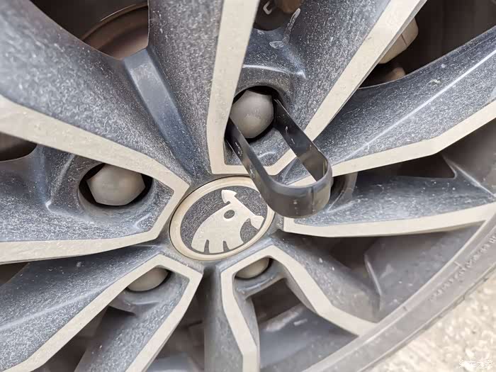 这是新车时候的照片。这样大家应该可以清楚的看到此类标记,然后此类标记的正下方凸出来的一块,就是整车的支撑点,这就是即将换备胎千斤顶所顶的位置,如果顶到其他地方位置没有找对的话,就会容易造成,其他位置瘪进去,从而使底盘受损。