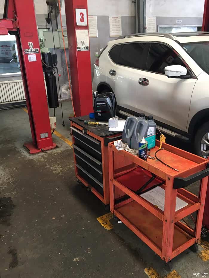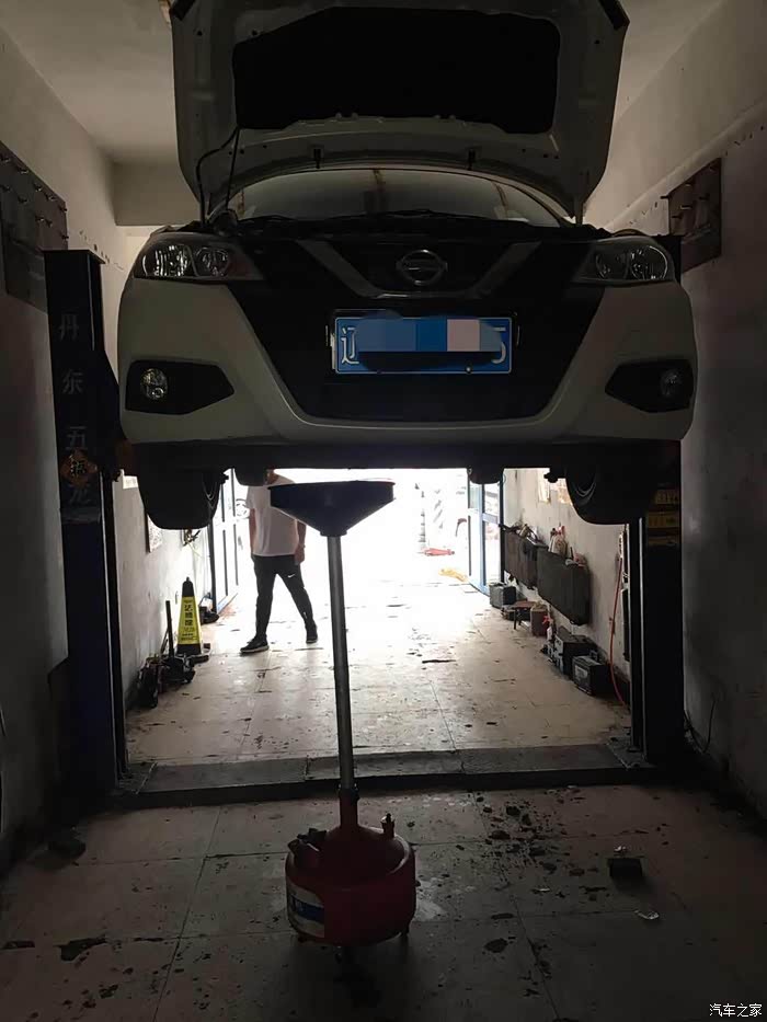 这回换机之所以没有去4S店,因为4S店距离我家比较远,而且费用还贵很多,所以在我朋友的修配厂换的机油,滤芯。 说说这次保养流程,首先车上架,升起来检查一番底盘,然后就进入正题,拧开放油螺丝,油桶在下面接住,直到流没油为止,拧下来机油滤芯,把新换滤芯抹上点机油在橡胶圈上,拧上就行了。