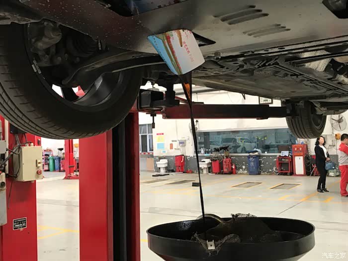 目测不算脏。由于发动机护板的安装挡住了机油排放口,维修小哥用一张广告纸给他改了道看来这事没少干