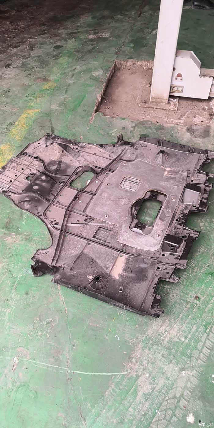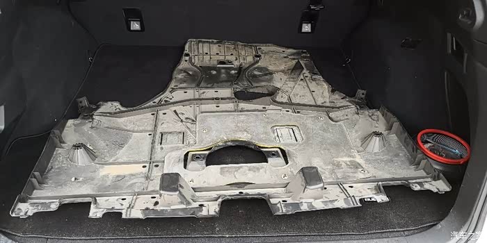 打开后备箱,取出车友王明强新购傲虎换装4S赠送的铝合金发动机护板后,闲置下来的原车树脂发动机护板。