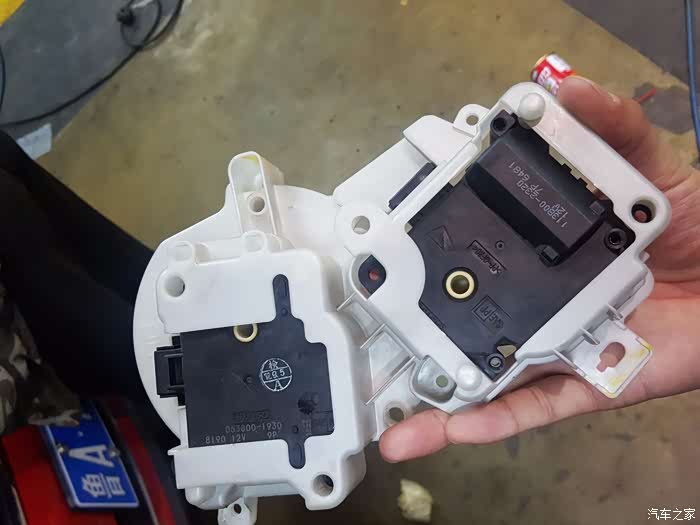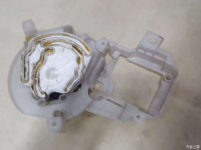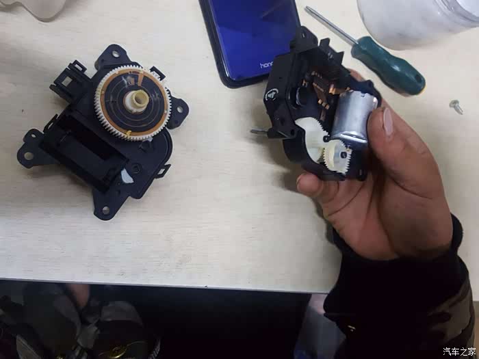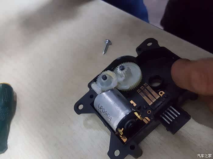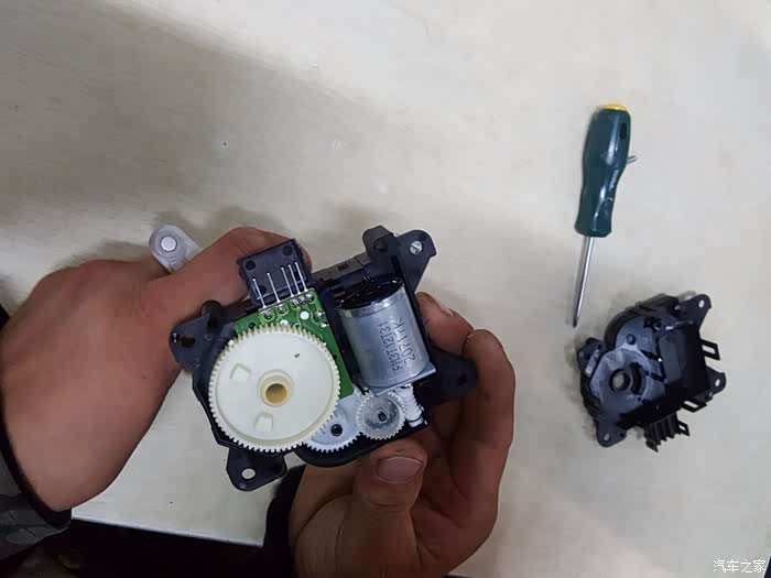 一台将近14W行驶公里的斯巴鲁傲虎空调伺服电机异响维修,拆下空调伺服电机,分解,给模块的齿轮涂抹润滑脂。