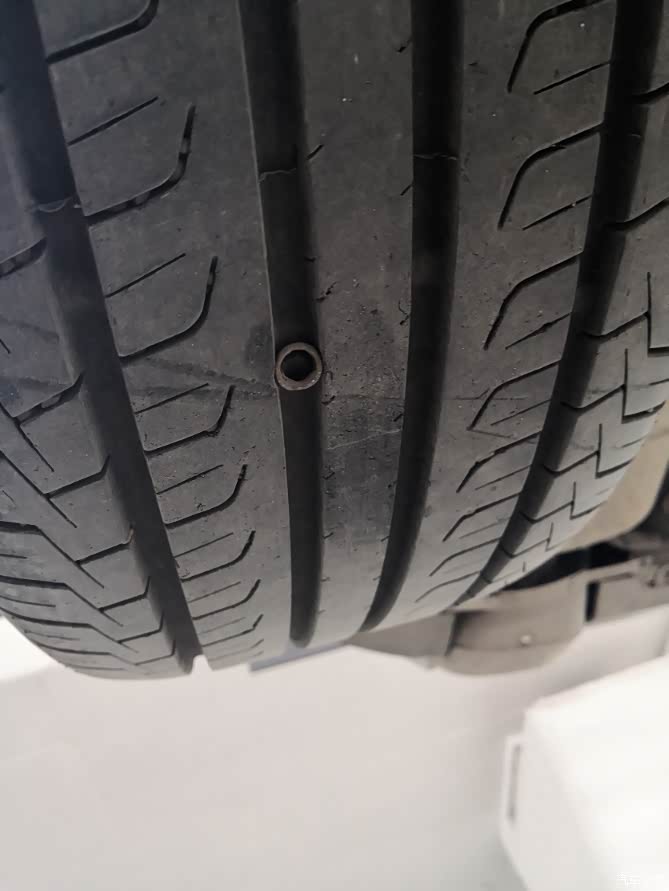 升起来以后轮胎上又发现了一个东西,扣一下没扣掉,没敢再扣了,不知道是卡在那了还是扎进去了,回头去修车店看看,四海不能补胎,没敢扣下来。