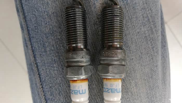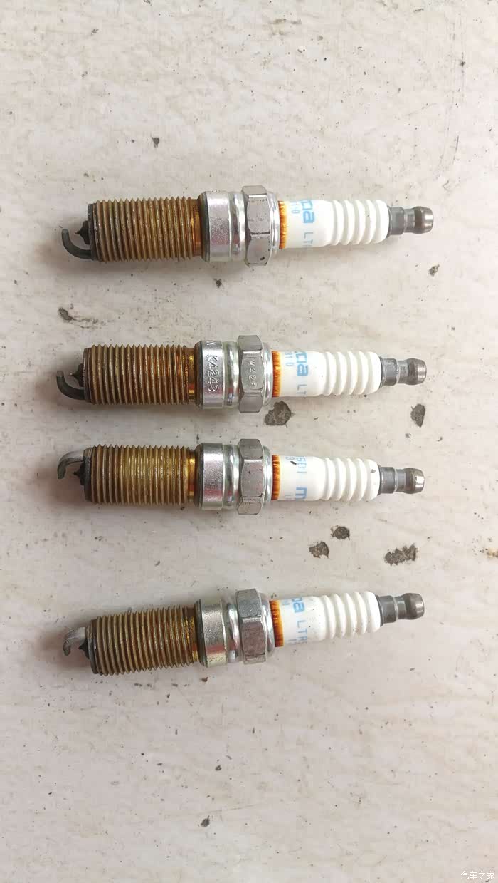 刚拆下的火花塞,可以看出燃烧不错,但有一颗燃烧不太均匀,偏黄