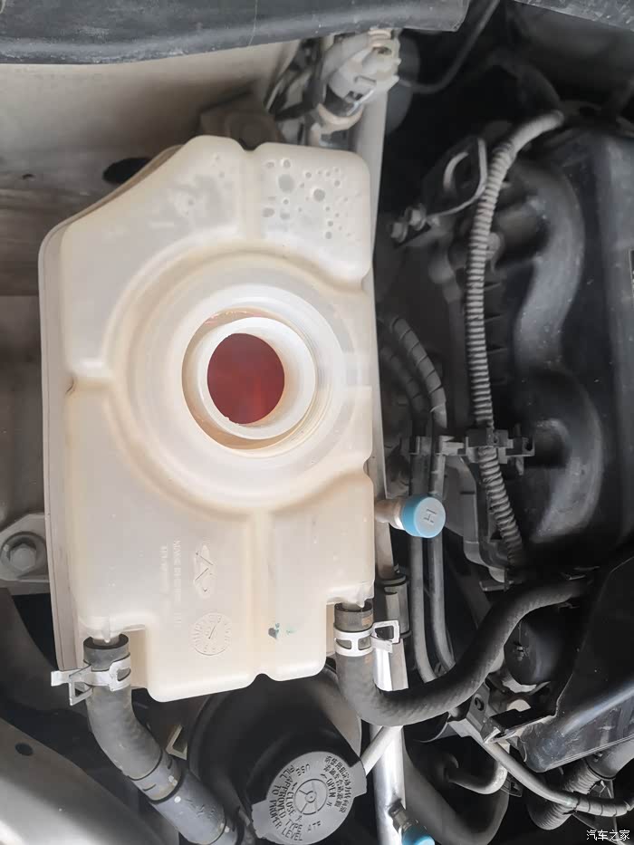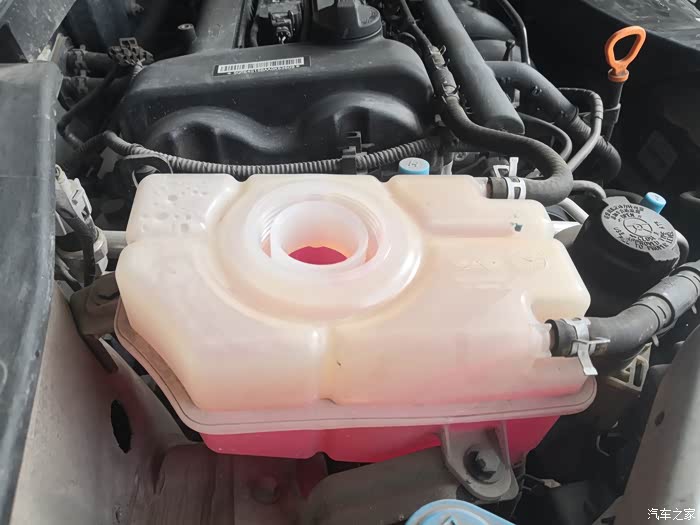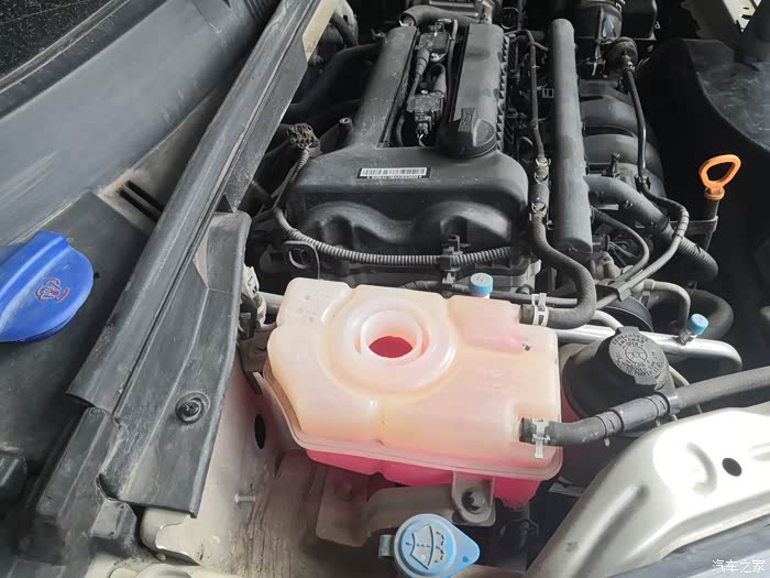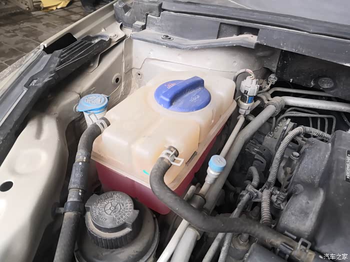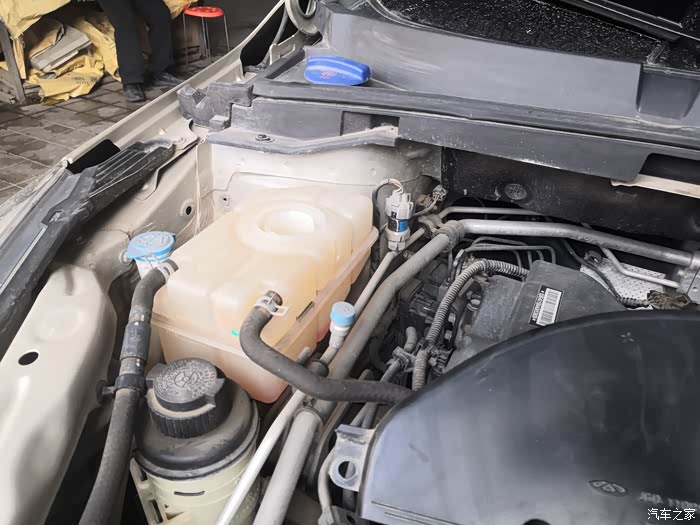 第一步打开引擎盖,防冻液壶在里面,呵呵