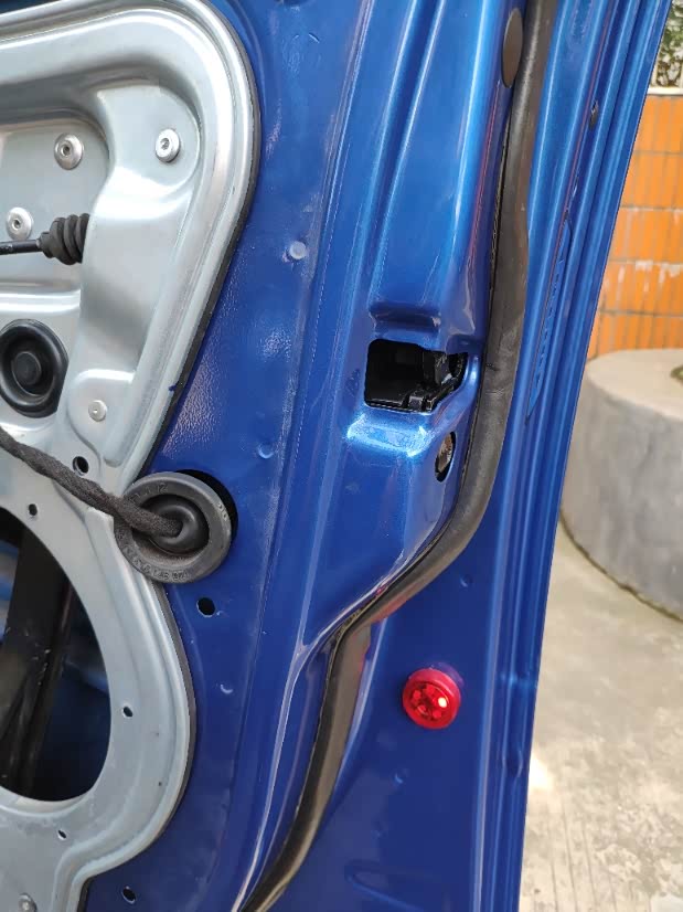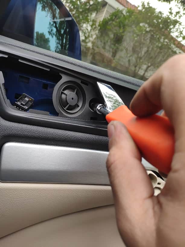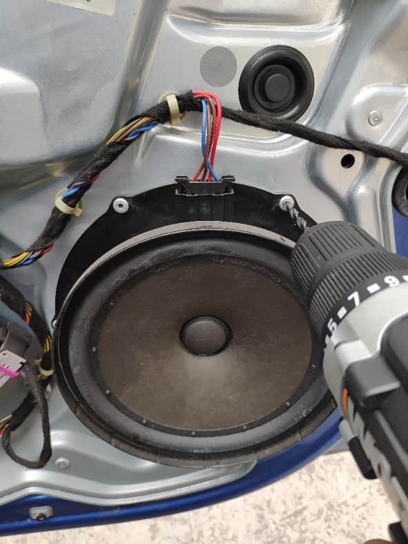 拆掉门内饰板后,用电钻(4.5mm的钻头)打掉低音喇叭的铆钉,拆掉低音喇叭。