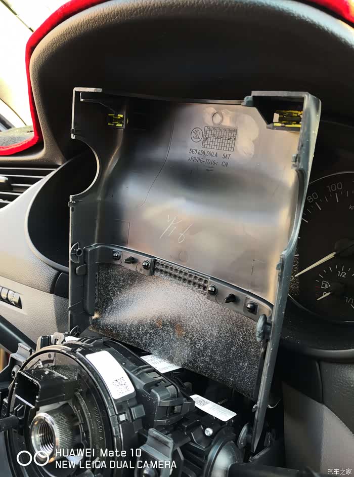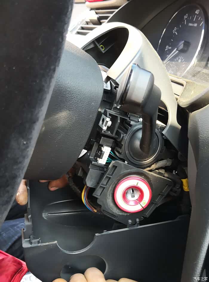 首先,拆封方向盘转向柱外包裹的上下共两片塑料外壳。(六处塑料卡扣和三颗螺丝固定)