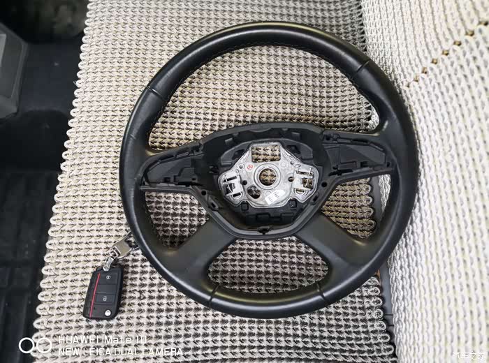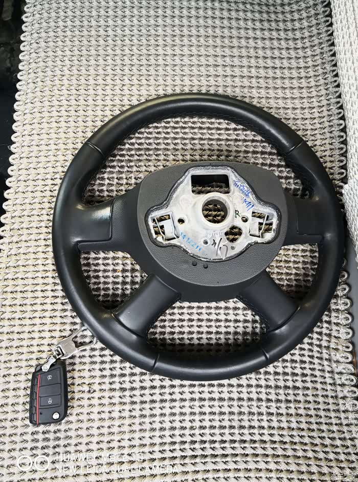 光荣退役的原车四辐多功能真皮方向盘体正面照。已挂闲鱼,300块出(详见正文部分)。