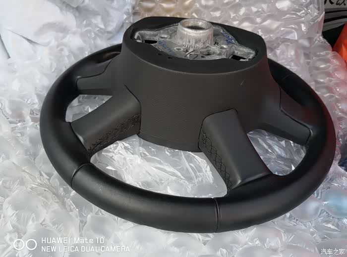 光荣退役的原车四辐多功能真皮方向盘体背面照。