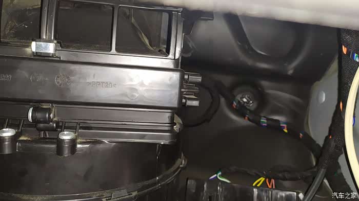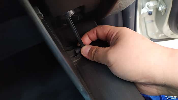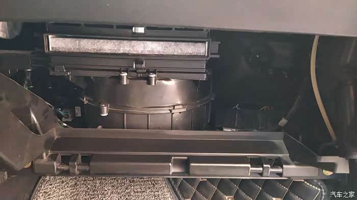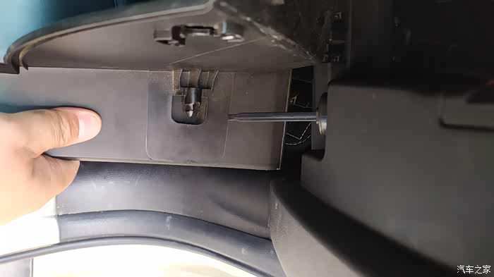 这样就看到空调滤芯的盖板了,两侧各有一个卡子固定,捏着上下的卡子就可以拆卸下来