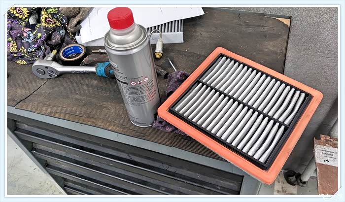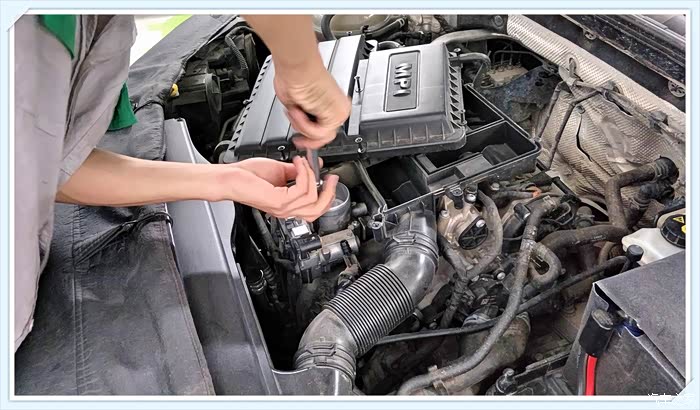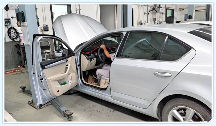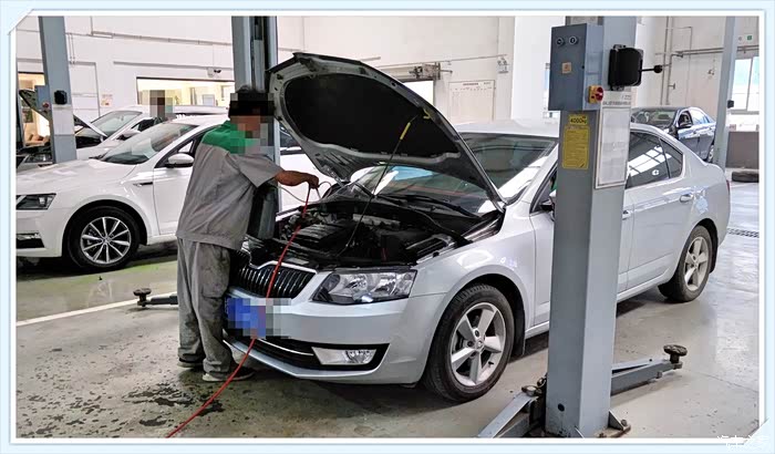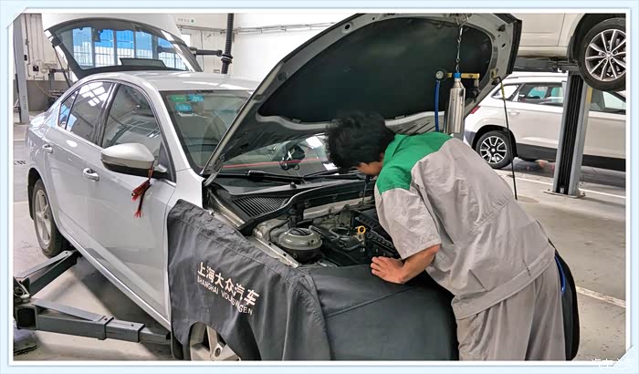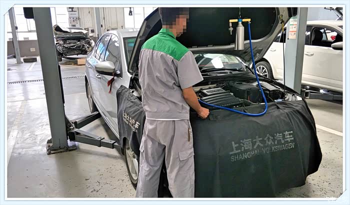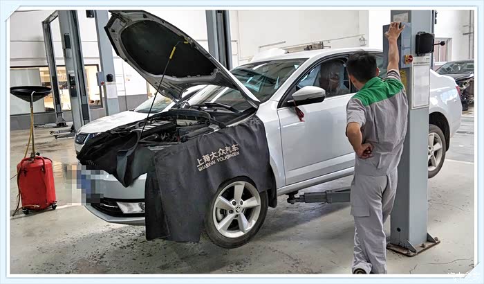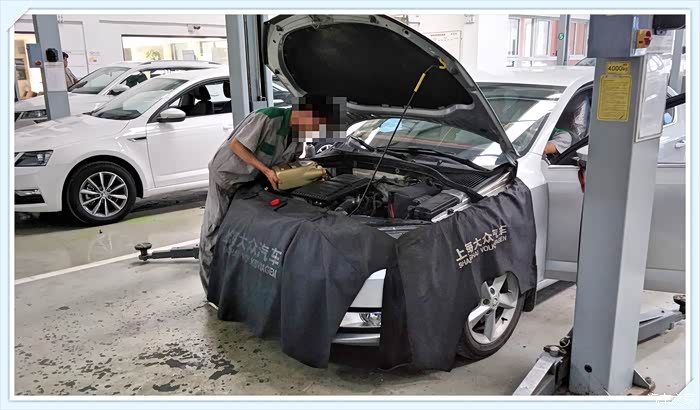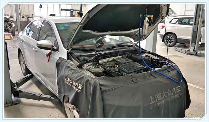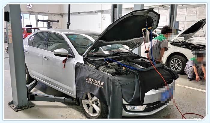 保养已经接近尾声了,一技工进行电脑检查,纠正故障码。另一个技工进行发动机仓清理工作。