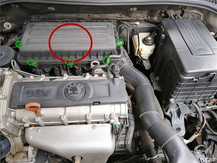 红圈部分就是装空气滤芯的地方,绿圈部分是5颗螺钉,用十字起子取出来(也可以不完全取出来,让其保留在盖子上),注意不要掉在机舱里哦,很难找的。