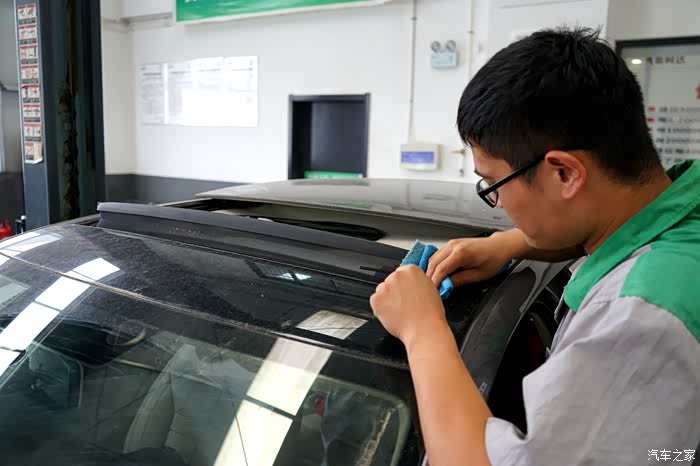 由于身处内陆平原,尘土很多,检测人员细心给我擦拭天窗,避免异响发生。