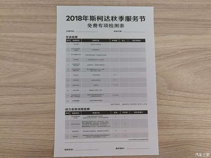 2018年斯柯达秋季服务节免费专项检测表,包括常规检测12个小项,动力系统深度检测4个小项。