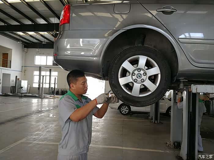 接下来服务人员用扭力扳手按照规定的力矩要求逐个对小明底盘螺栓进行紧固检查。