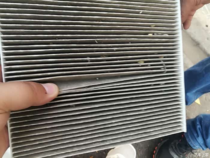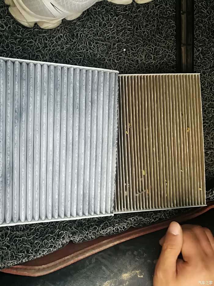 两个滤芯对比下,就看出区别了,新买的厚实,格栅比较大,比较疏,但是有黑色的活性炭,原车的格栅小,比较密集,但是比较单薄