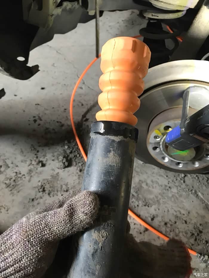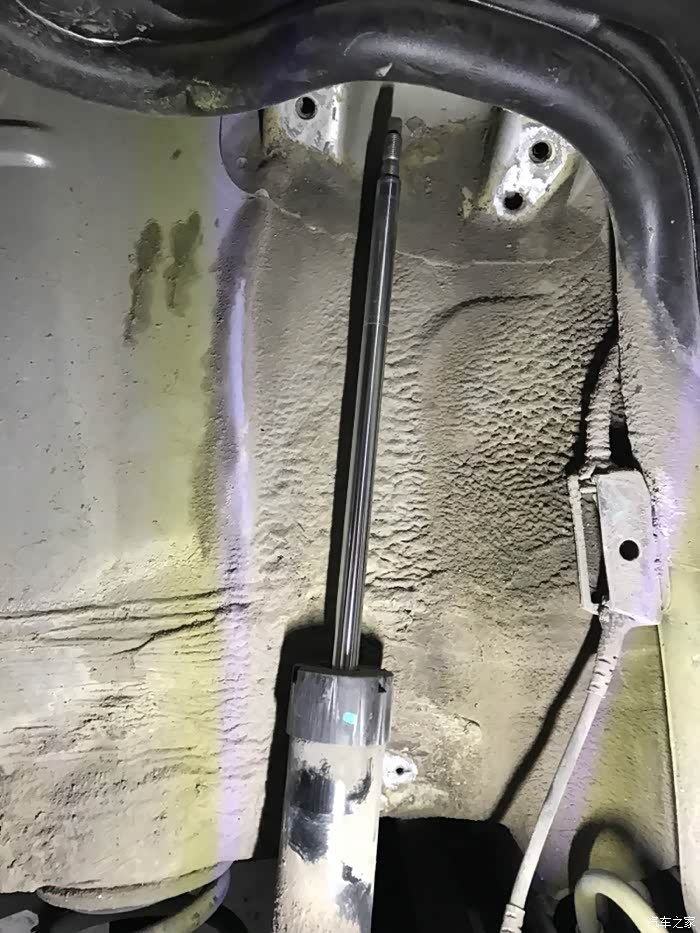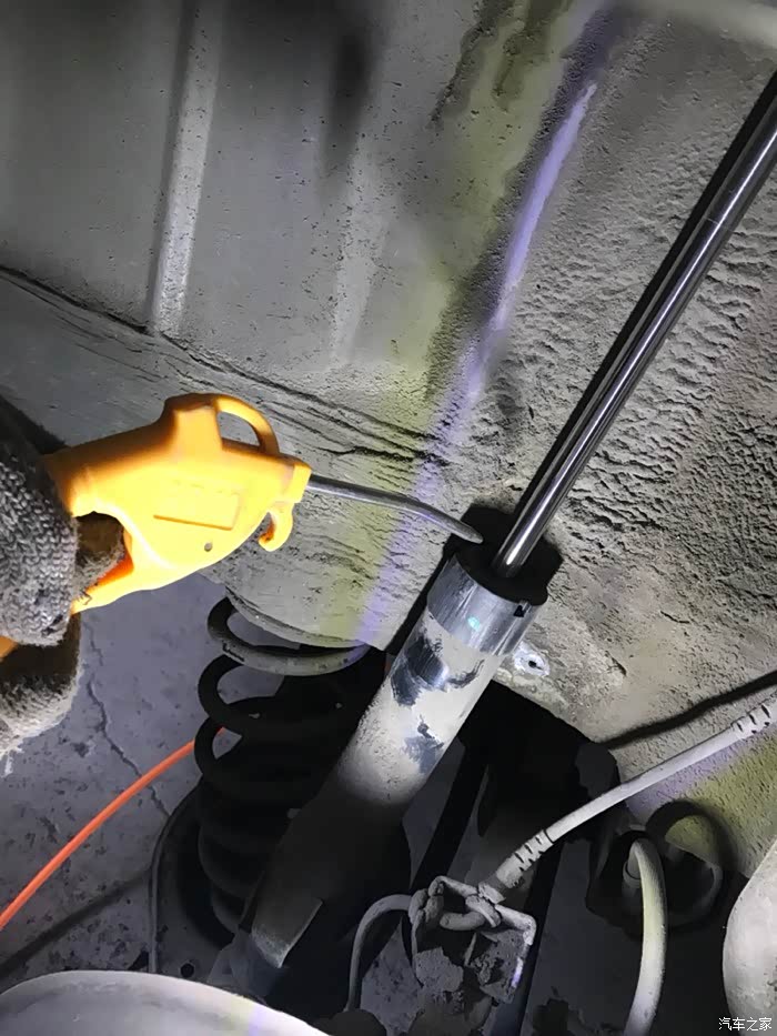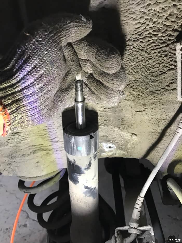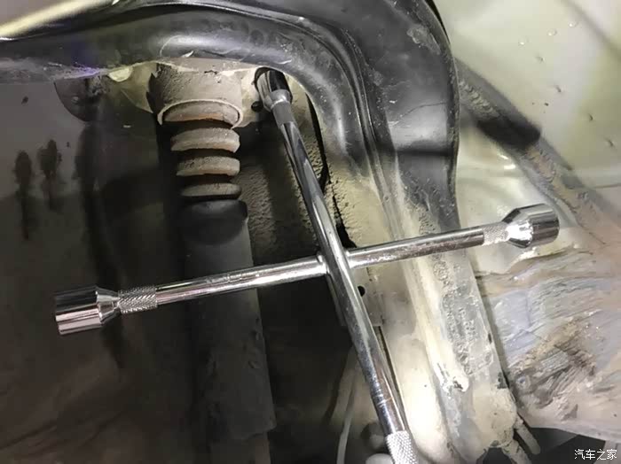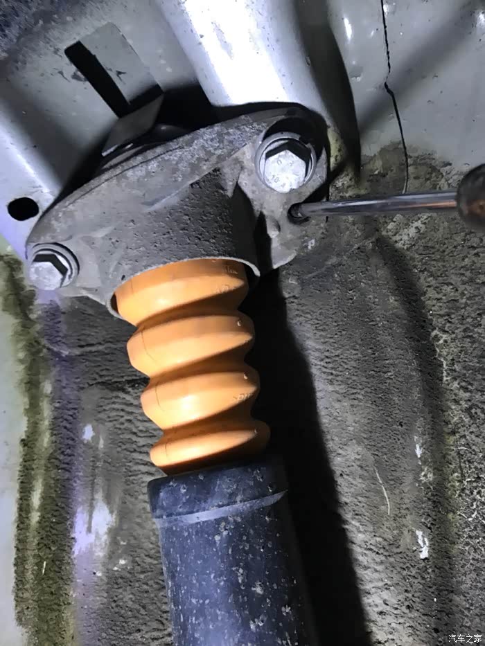 松掉螺丝后两手扒着减震顶部往下压到底,把顶部的黑色半球形塑料罩拔掉,左手扶着右手把专用套筒扳手套上,再用22开口扳手把减震顶部的固定螺丝拧下来,就一颗不是很紧,这里没有拍照