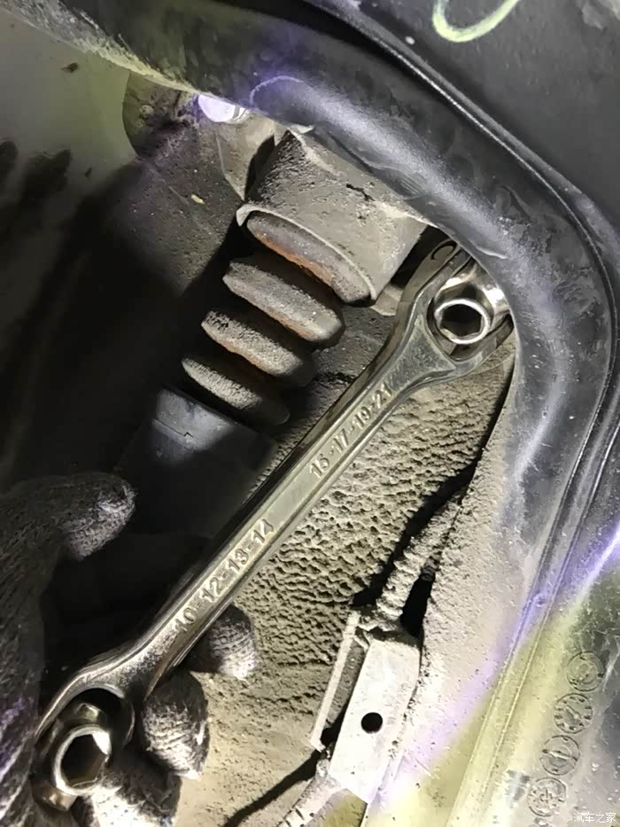 由于十字套筒横杆太长拧松后用这个扳手拧下来比较方便,这个也是17的,但是右边有油管挡着导致这个扳手套不进去,就只能用十字套筒慢慢拧了