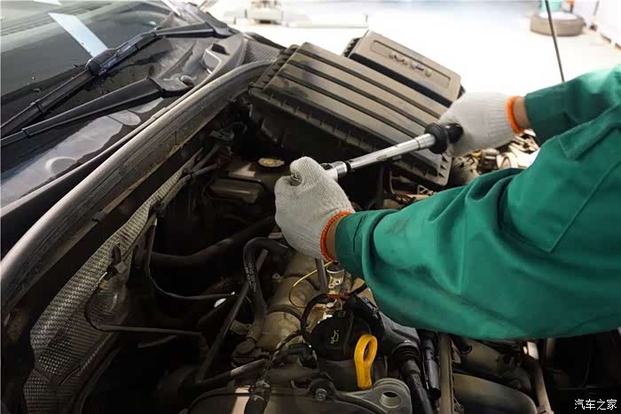 简单擦拭点火线圈(俗称:高压包)桩头附近的灰尘和油污,然后用套筒拧下高压线桩头的固定螺丝。