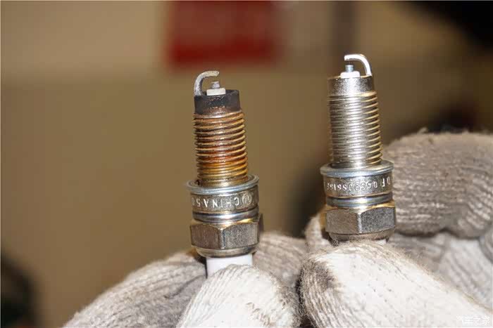 对比一下,左侧是原车的3万公里后的,右侧是新的火花塞。