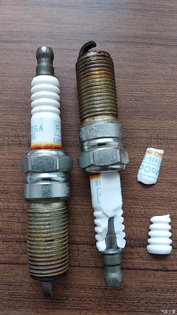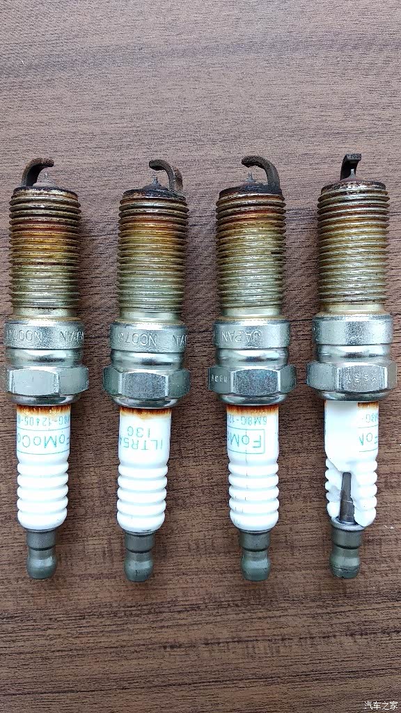 拆下的4根火花塞,电极状态良好,其中右边2根陶瓷体破裂。